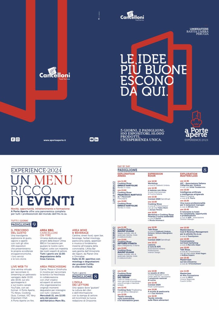 I prossimi 19-20-21 Febbraio, presso Umbria Fiere di Bastia Umbra (PG), si terrà l’edizione 2024 dell’evento “A PORTE APERTE” organizzato da Cancelloni Group Service, un’esperienza imperdibile con tutti i maggiori protagonisti del panorama HoReCa.