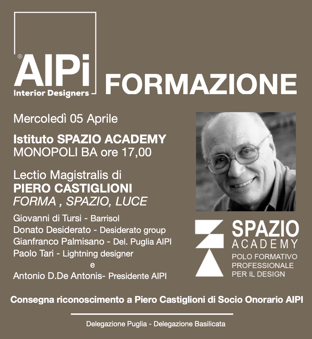 Monopoli 5 Aprile. Istituto SPAZIO ACADEMY. L’arch.Piero Castiglioni presenterà una lectio magistralis: “FORMA, SPAZIO, LUCE”. Studio Piero Castiglioni Luce e Architettura P