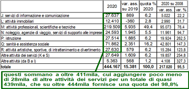 Circa la metà della categoria (49,4%) svolge attività scientifiche e tecniche ad alta specializzazione, ma a registrare gli incrementi più forti tra il 2008 e il 2020 sono le attività complementari dei servizi alla persona, dall’istruzione (+262%) all’assistenza sociale (147%) e al tempo libero (123%).